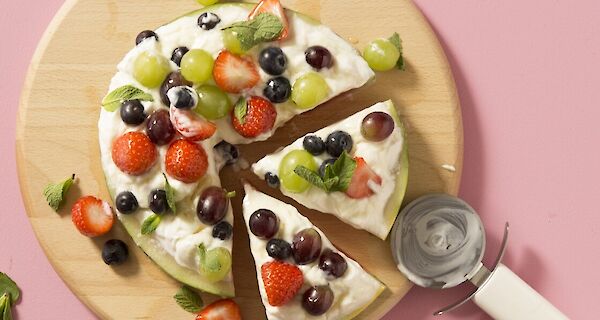 Zin in pizza maar niet in hartig? Probeer dan eens deze fruitpizza. Gebruik een dikke schijf watermeloen als ‘pizzabodem’, besmeer ‘m met kwark, en versier met seizoensfruit.. Een heerlijk zomers gerecht.
